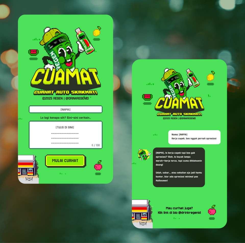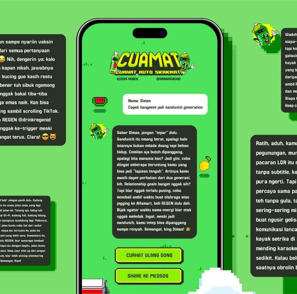 CUAMAT (Curhat Auto Skakmat) was born from a simple emotional insight: Gen Z loves to rant online to release their thoughts and cope with daily chaos. We turned that behavior into a playful digital campaign where users could submit their feelings and receive personalized responses. The experience encouraged sharing and helped position REGEN not just as a drink but as a cultural companion in Gen Z’s emotional routine.